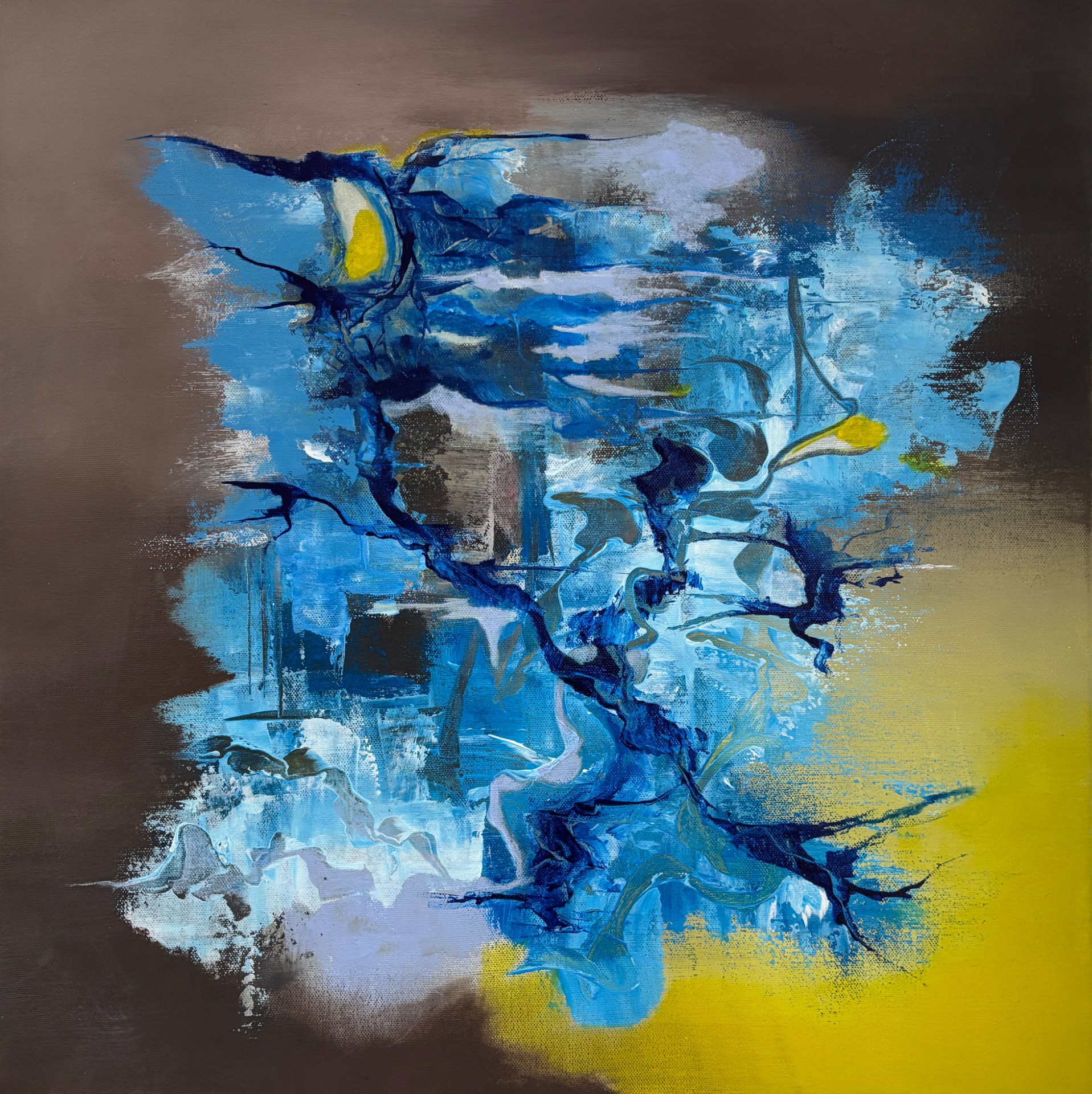Tento abstraktní obraz evokuje pocit tajemství a hloubky, skrývající se pod ledovou vrstvou. Kombinace studených odstínů modré a hnědé, podtržená studenou žlutou, vytváří atmosféru mrazivého prostoru, ve kterém se pohybují nedefinované formy. Povrch obrazu připomíná zamrzlou vodní hladinu, pod níž se skrývá neviditelný svět. Tato dynamická kompozice a kontrast barev vyvolává dojem pohybu a proměny, jakoby pod ledem něco čekalo, až bude odhaleno.